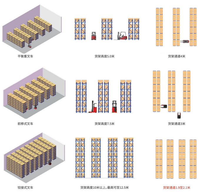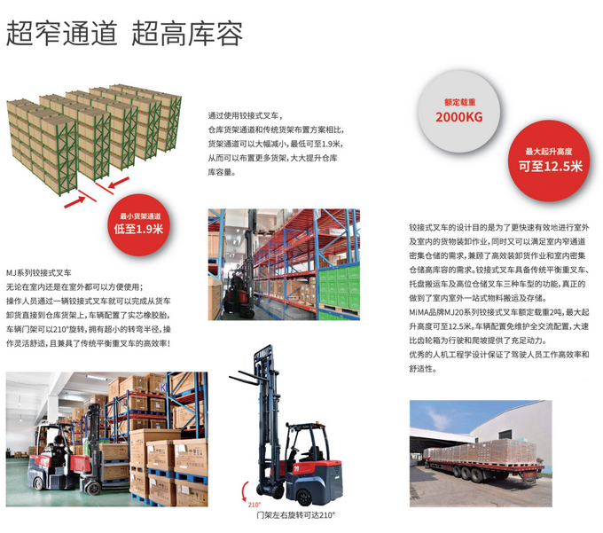 ?超窄巷道作業(yè),通道寬度可達2M大角度門架擺角設(shè)計(擺頭角度可達210度)更大程度減小通道寬度,提高庫容量;
