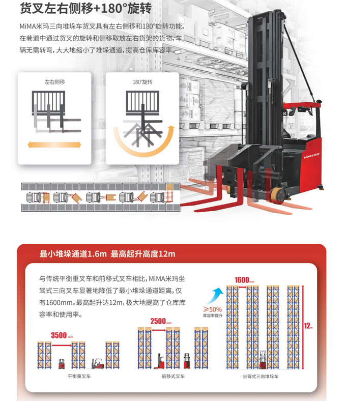 MC系列窄通道三向堆垛車(chē)能節(jié)約通道面積,利用面積與高度優(yōu)勢(shì),顯著增加庫(kù)容量。